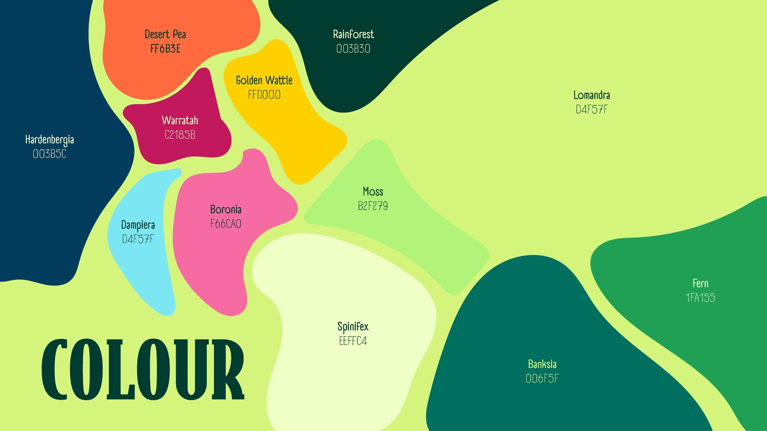 As the project evolved, it became clear that a single plant could not capture the ANBG’s botanical diversity. The Golden Wattle became the seed for a larger system: a curated library of stylised shapes from multiple native species. Each form was refined for clarity and cohesion, paired with a botanical colour palette designed for flexibility and contrast.